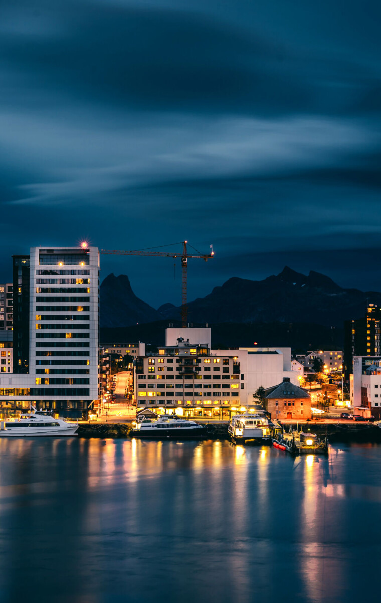 A long exposure photograph of Bodø city at night with dramatic clouds
